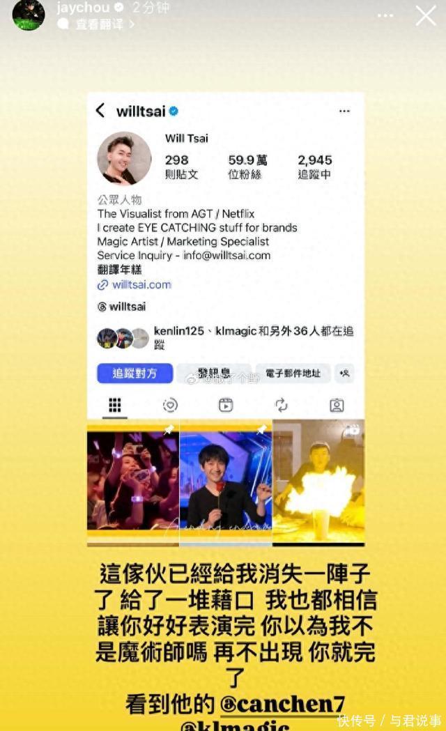 10日周杰伦一条删了又删的动态,把魔术师蔡威泽推上风口!他直接喊话对方“毫无预警消失,找借口我都信了,再不出现你就完了”,虽然帖子很快删掉,但取消关注的操作,明眼人都看出俩人彻底闹掰了。 要知道这可不是普通合作关系!蔡威泽是周杰伦的“魔术搭子”兼好友:《周游记》里被喊“快乐小伙伴”,春晚《告白气球》的魔术是他设计的,2023年周杰伦还公开为他庆生说“互相扶持”。可这次矛盾爆发后,蔡威泽只丢了句英文声明“暂离社交平台,不回应”,连句解释都没有,网友直接调侃“这是最失败的消失术”。