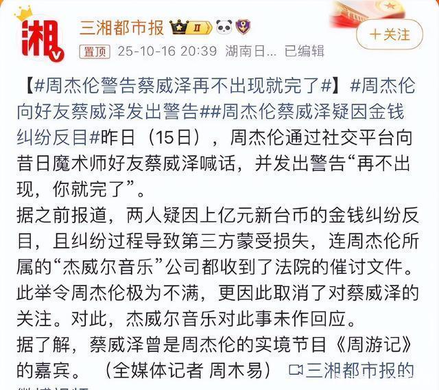 最让人反感的是那些造谣“资金纠纷”的营销号,为了流量连基本事实都不顾。要知道这种不实爆料,不仅会毁了俩人的关系,还可能影响蔡威泽的职业生涯。还好现在越来越多人看清真相,评论区全是“别扯钱,就是信任没了”“蔡威泽赶紧出来说清楚”。 其实这事儿戳中了所有人的痛点:友情里最忌讳的不是吵架,是“我还在等你解释,你却早已消失”。周杰伦的愤怒,本质是对“互相扶持”的失望;而蔡威泽的沉默,不管是职业习惯还是刻意回避,都已经伤了人心。就像网友说的,这哪儿是明星纠纷,分明是“江湖义气撞上了敷衍回避”的现实缩影。
